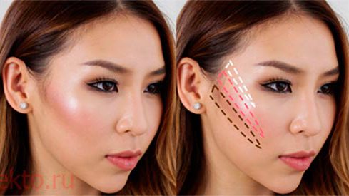 В данной технике на главную роль выходят румяная. Именно они берут на себя фикцию «главного скульптора». В помощь к румянам добавляются темные оттенки консилера, но они играют лишь вспомогательную роль, оттеняя яркость румян. Чтобы сгладить излишнюю яркость макияжа применяют хайлайтеры, роль которых на себя могут взять светлые оттенки консилеров.